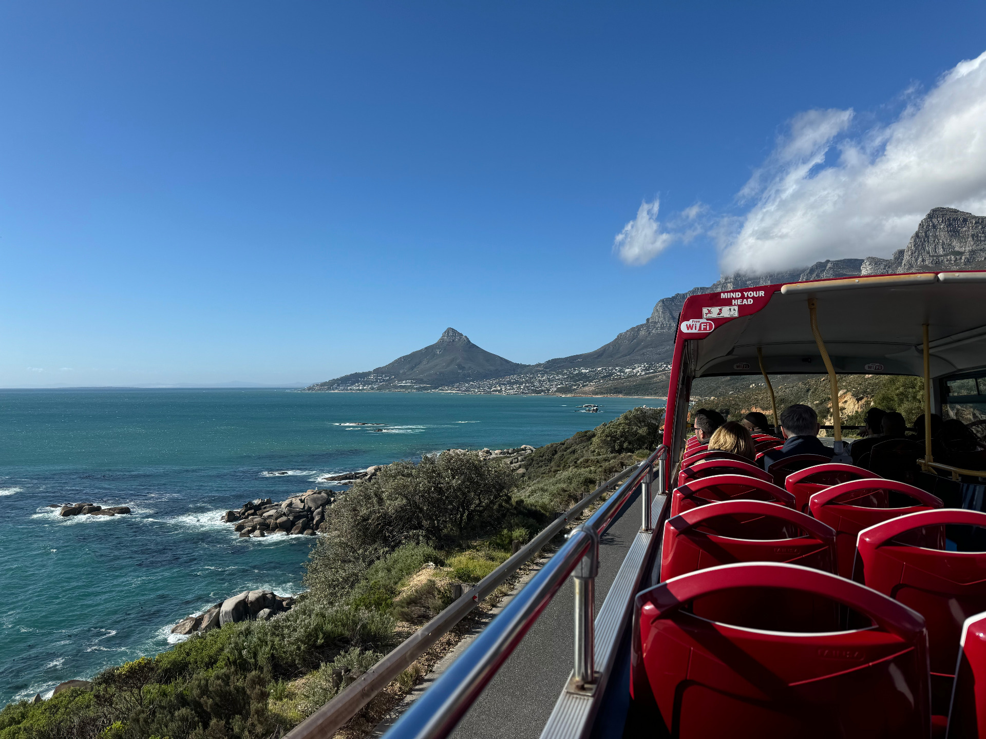Vanaf ons appartement in de Gardens het stukje wandelen afgevinkt. Via Kloof Street door naar Loop Street en hier door het stadscentrum heen gewandeld. Om vervolgens uit te komen bij de hop on, hop off bus. Super toeristisch, maar wel een handige manier om de omgeving van Kaapstad te verkennen. Voorzien van oortjes om ons te voorzien van alle info, lekker de hele dag uitgewaaid boven in de bus.