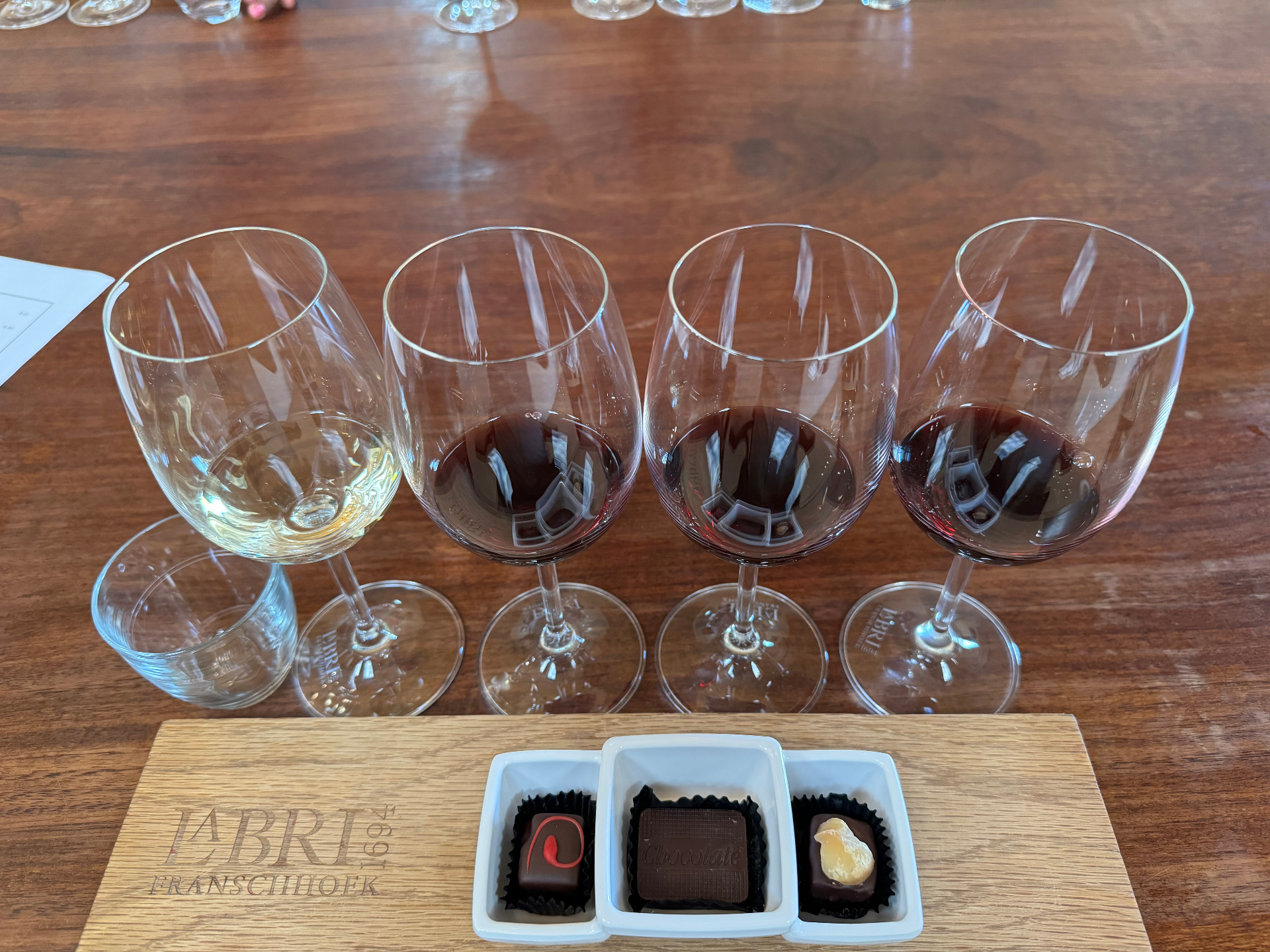 - Wijn proeverij met chocola in Franschhoek bij La BRI - 3 chocolaatjes - 4 glazen.